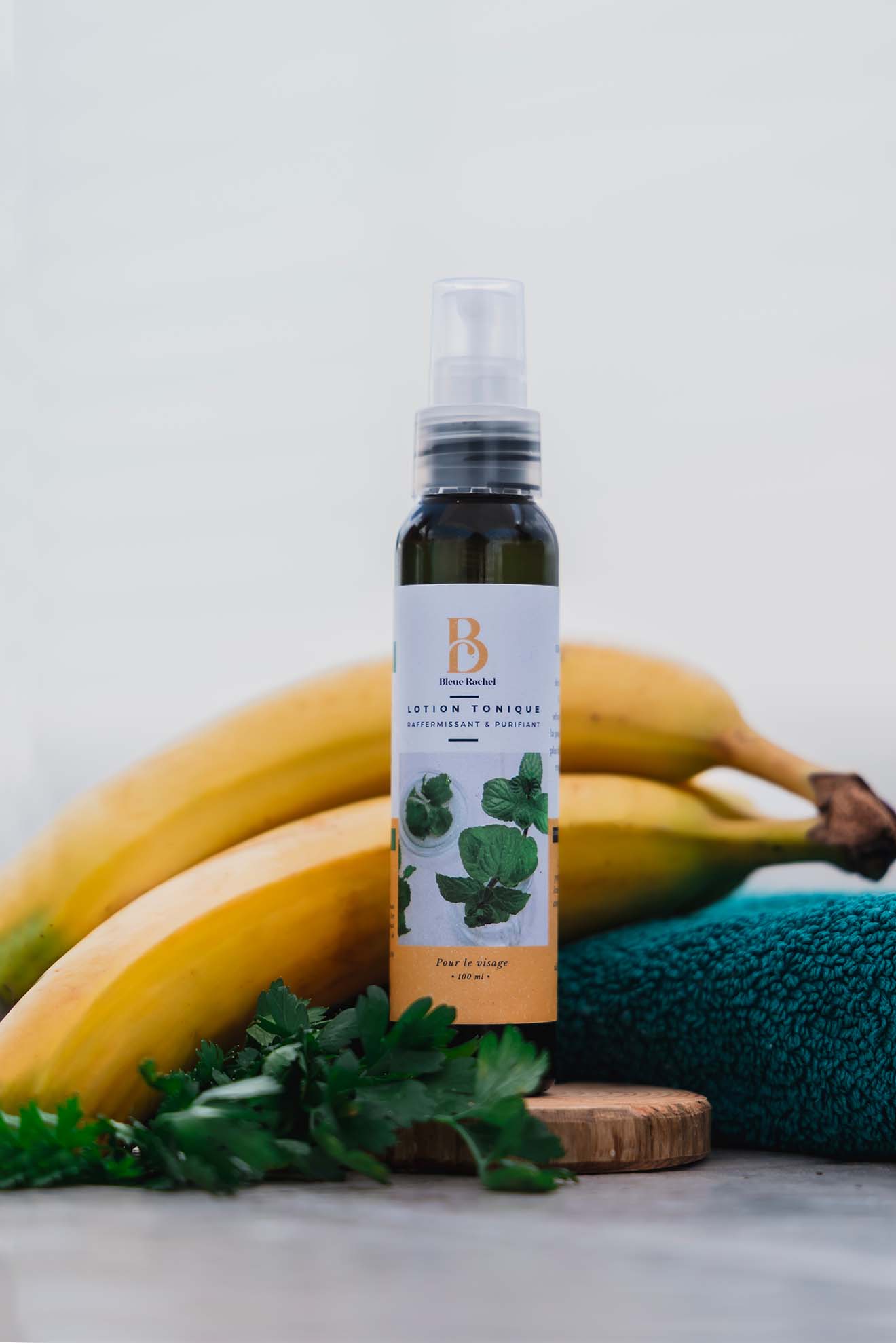 La lotion tonique menthe–banane resserre les pores et apporte un effet matifiant naturel.